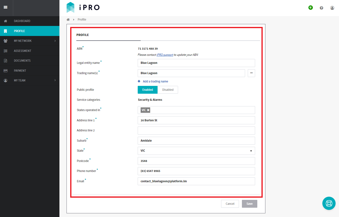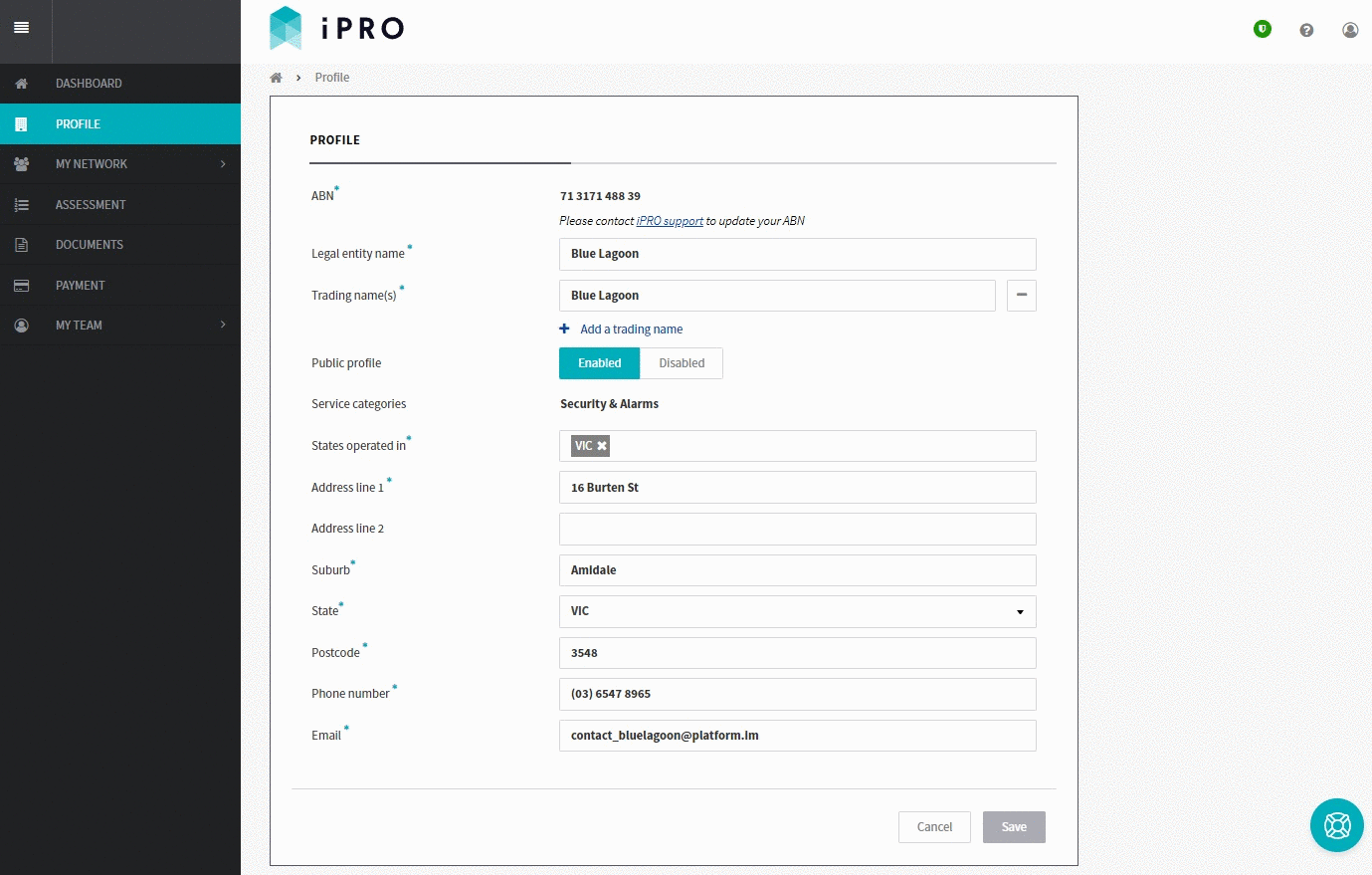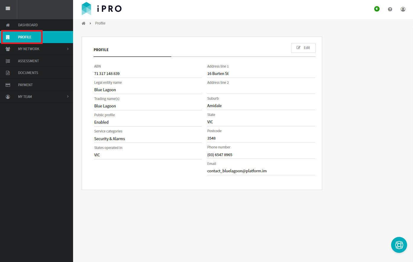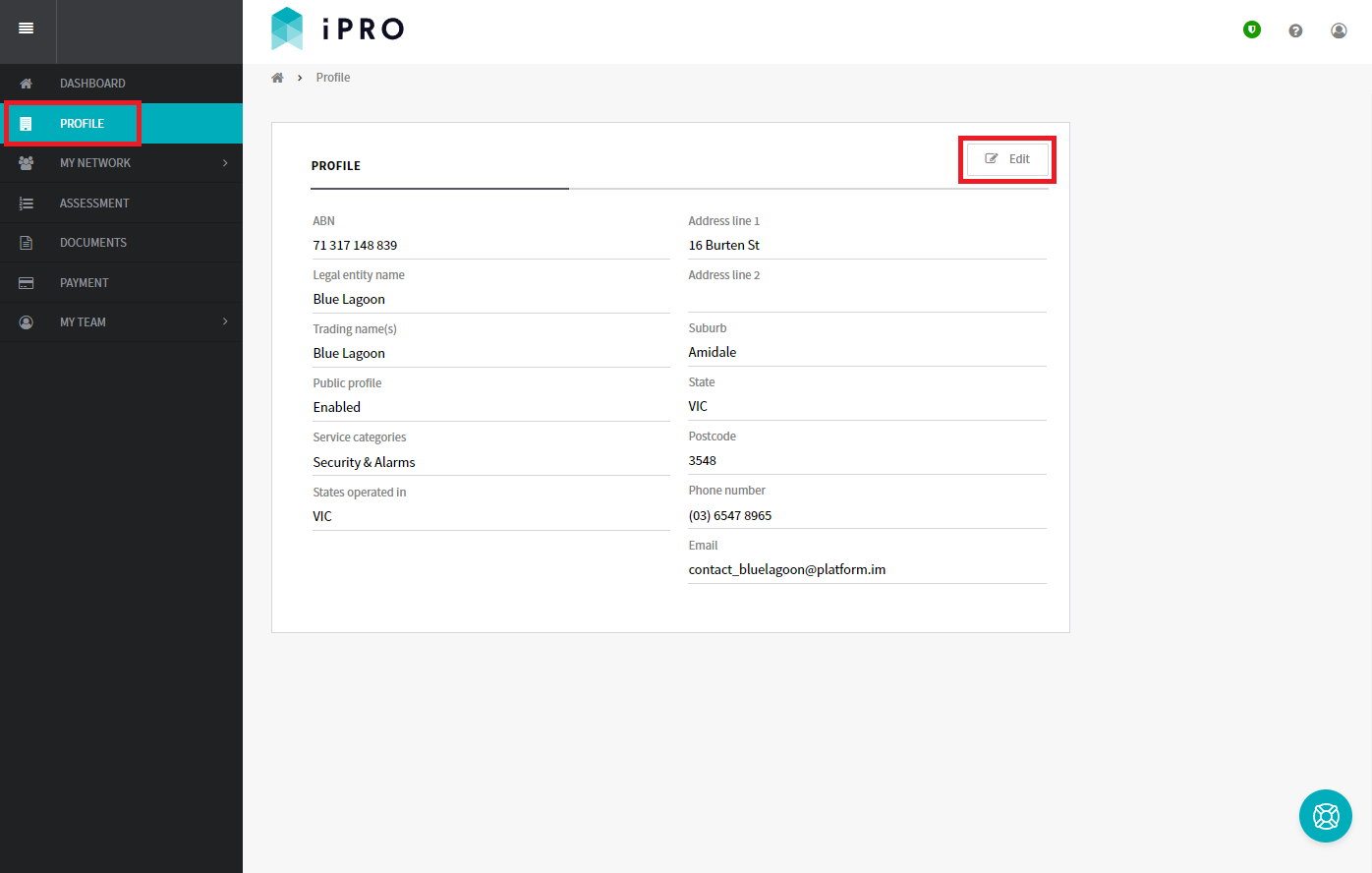 - The ABN displayed in the profile can only be changed by iPRO. Please email the Customer Care Team at helpdesk@ipro.net for assistance.