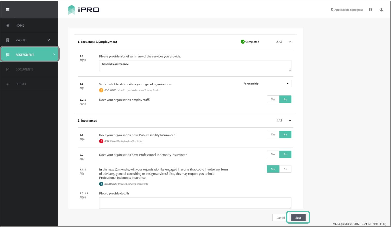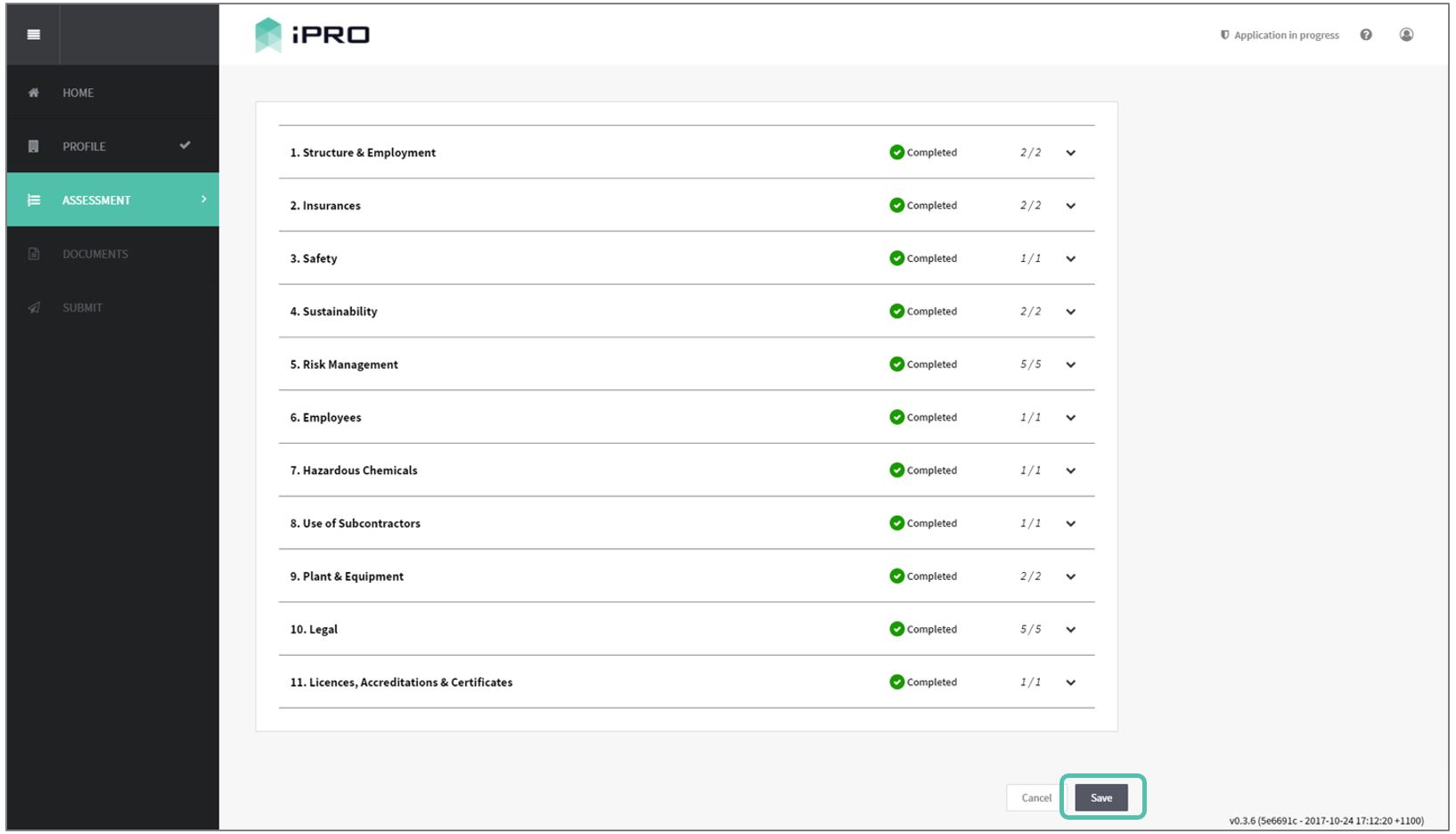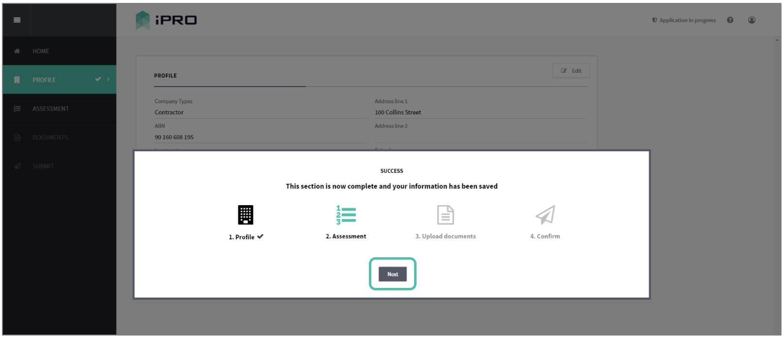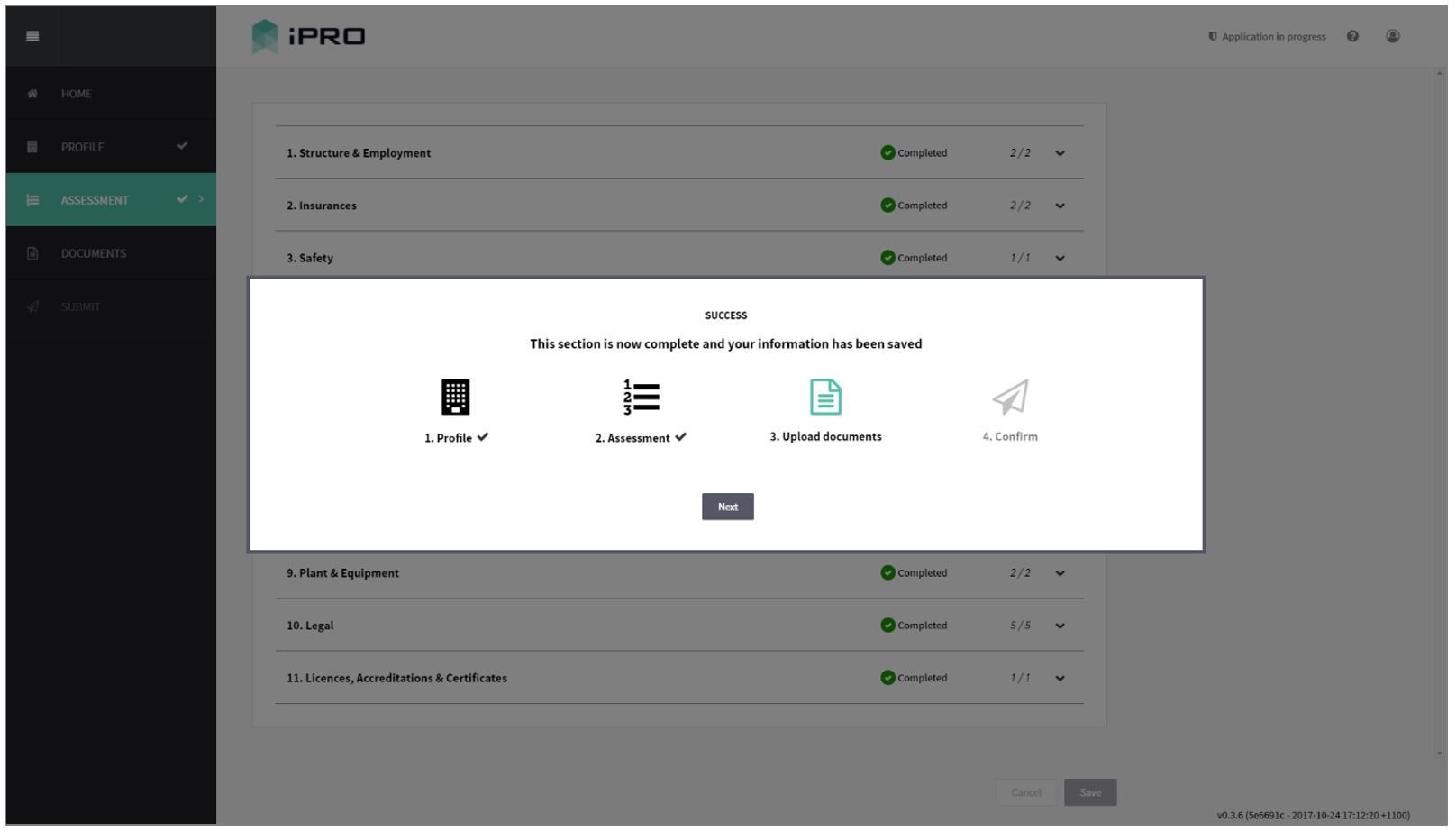 6. Once you have completed the assessment and clicked 'Save', the following screen will display. Clicking 'Next' will start the documents section. If this screen does not appear, there will be a question that remains incomplete. Please check all sections to ensure a completed icon is shown next to each assessment section (refer above).