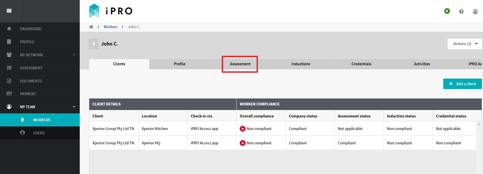 You will be re-directed to the worker's compliance summary, displayed within the Clients tab. The worker must be connected to a client and its location (if applicable) in order to complete the worker assessment. For more information, refer: Managing a Worker's Client Connections.