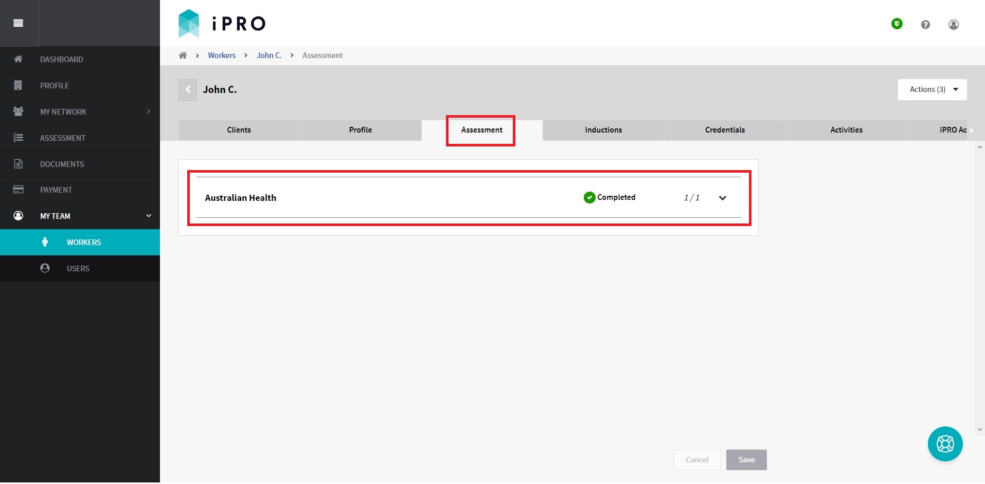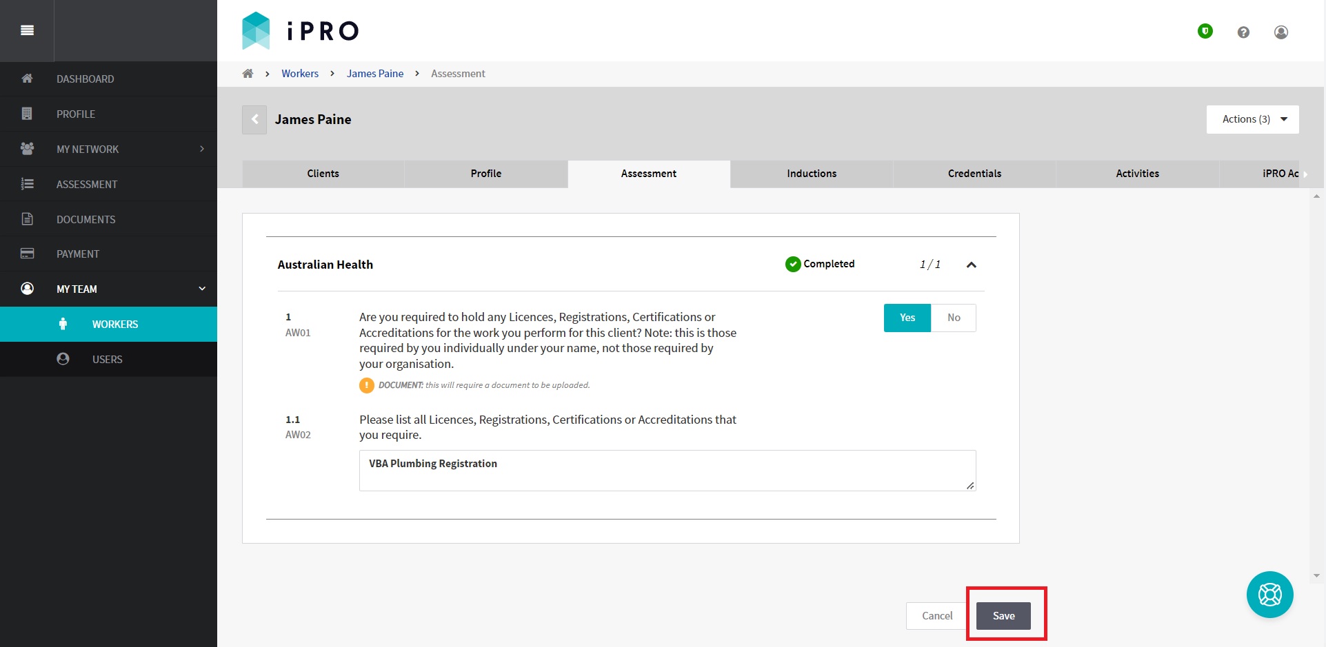 Log in > MY TEAM > WORKERS > Worker name > Assessment tab > Assessment section > respond to questions > Save