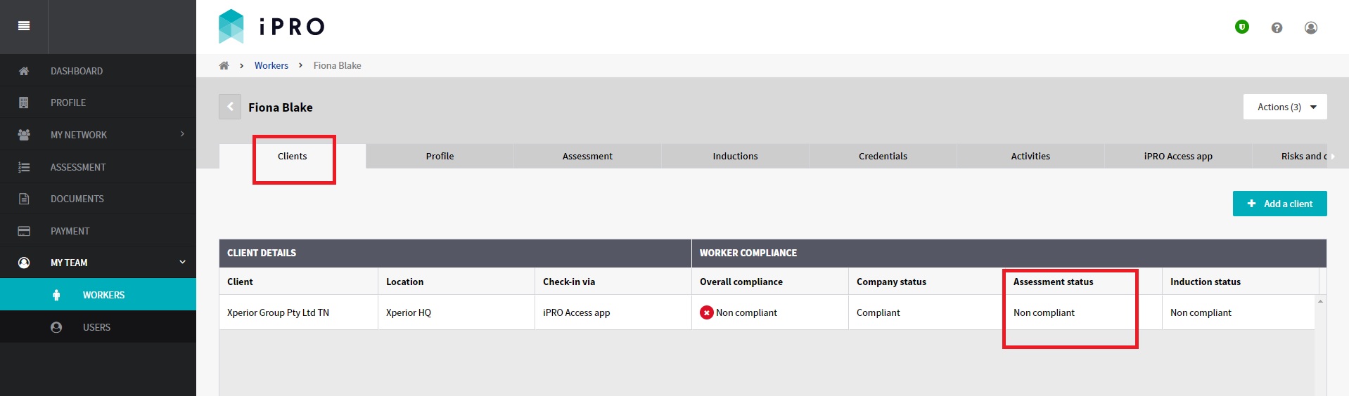 - The Assessment status will show as Non compliant. This status indicates that the worker assessment is incomplete, and requires response.