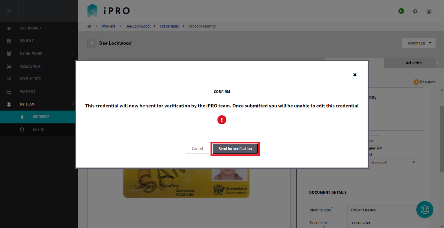 Note: the DOCUMENT DETAILS fields will differ depending on the credential being uploaded. - When presented with the confirmation, click the Send for verification button to submit the credential for verification.