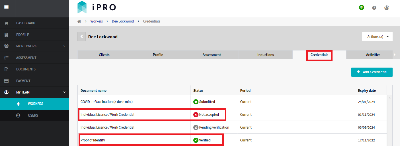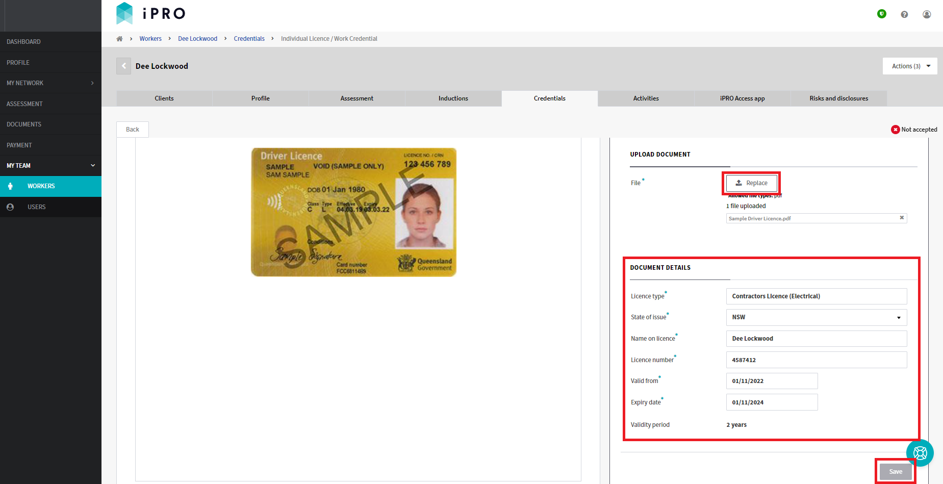 Log in > MY TEAM > WORKERS > Worker name > Credentials tab > 'Not accepted' credential > Replace > update Document Details > Save