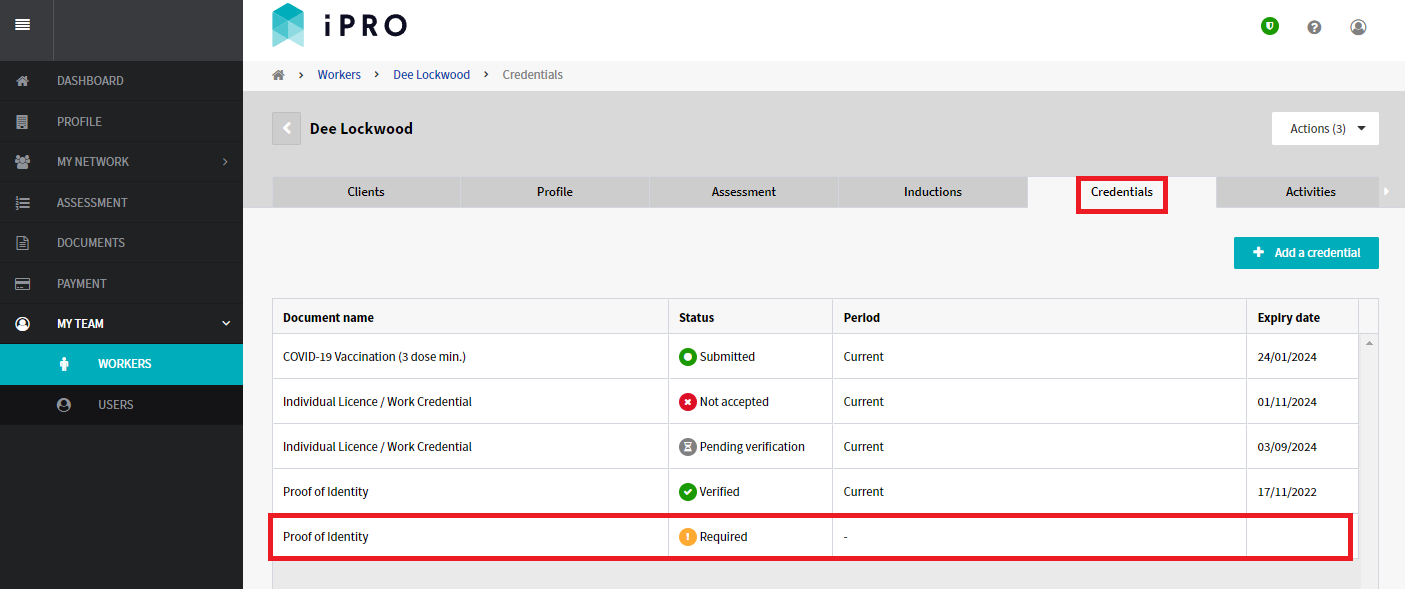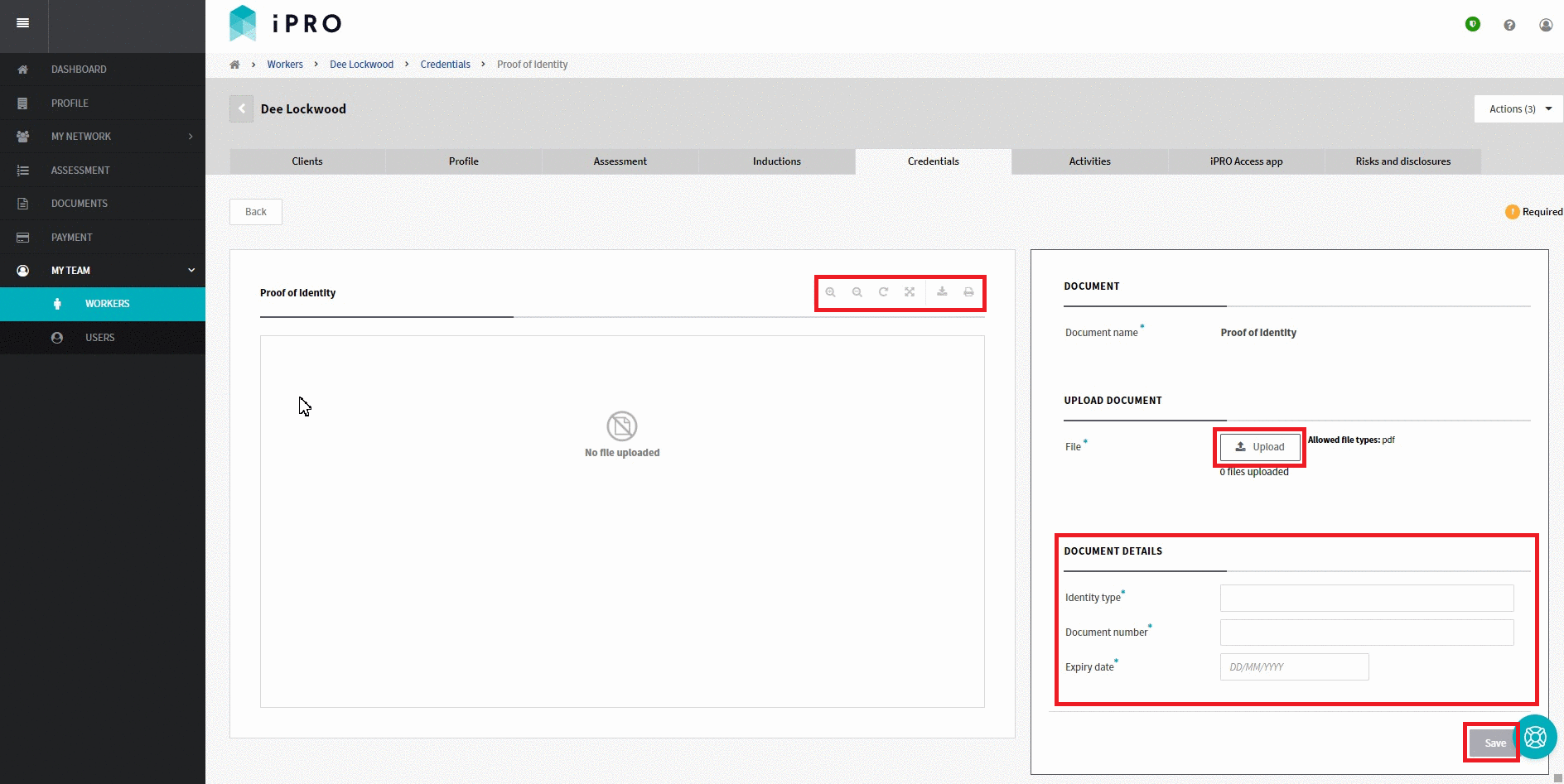 Log in > MY TEAM > WORKERS > Worker name > Credentials tab > 'Required' credential > Upload > enter Document Details > Save