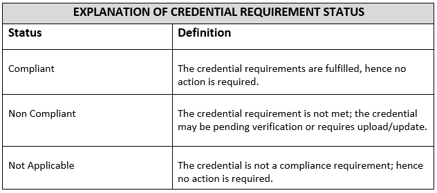 You will be redirected to the worker's compliance summary, displayed within the Clients tab, where the credential's status is displayed. To understand a credential's status to determine the requirement, refer to the table below titled Explanation of a Credential's Requirement Status below.Notes: