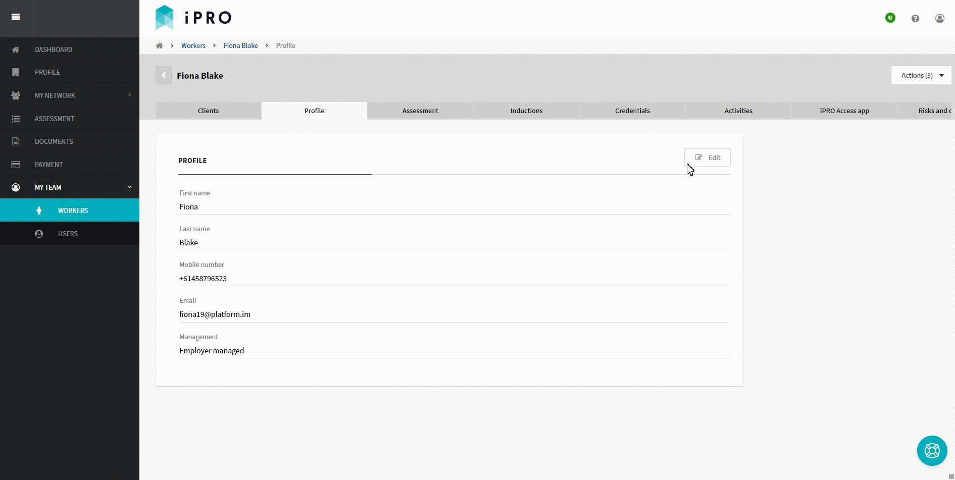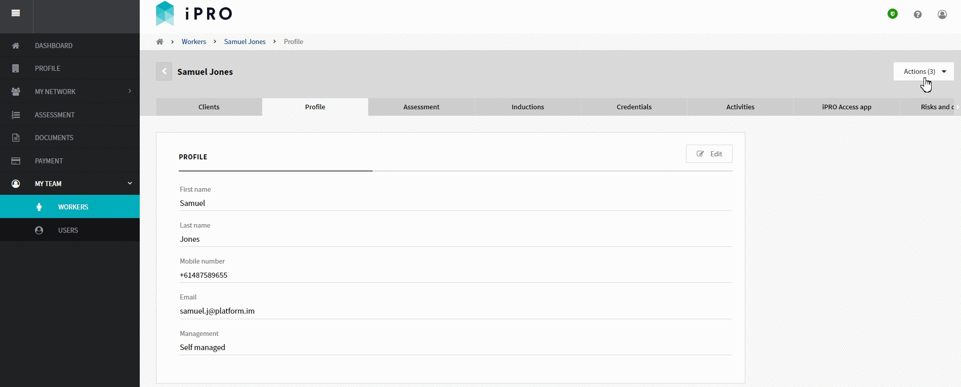 If the email address is changed for a worker with Invited as their status, resend the invitation for the worker to activate their iPRO worker account by setting a password. To do this, click on the Actions (3) button, and then select Invite to iPRO access. To confirm, click on the Send Invitation button.