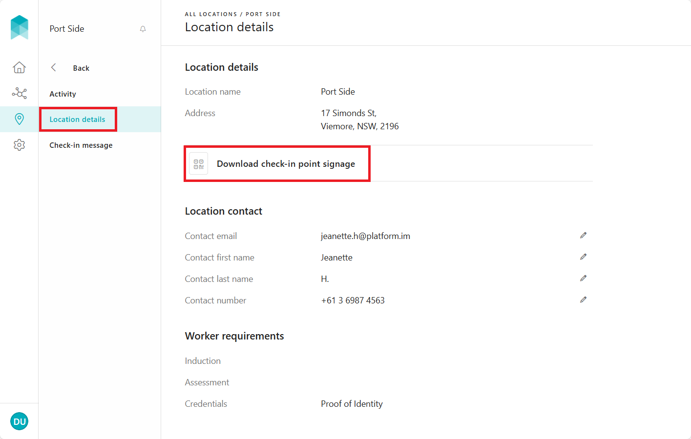 Log in > Locations > All locations> Find and click a location > Location details > Download check-in point signage