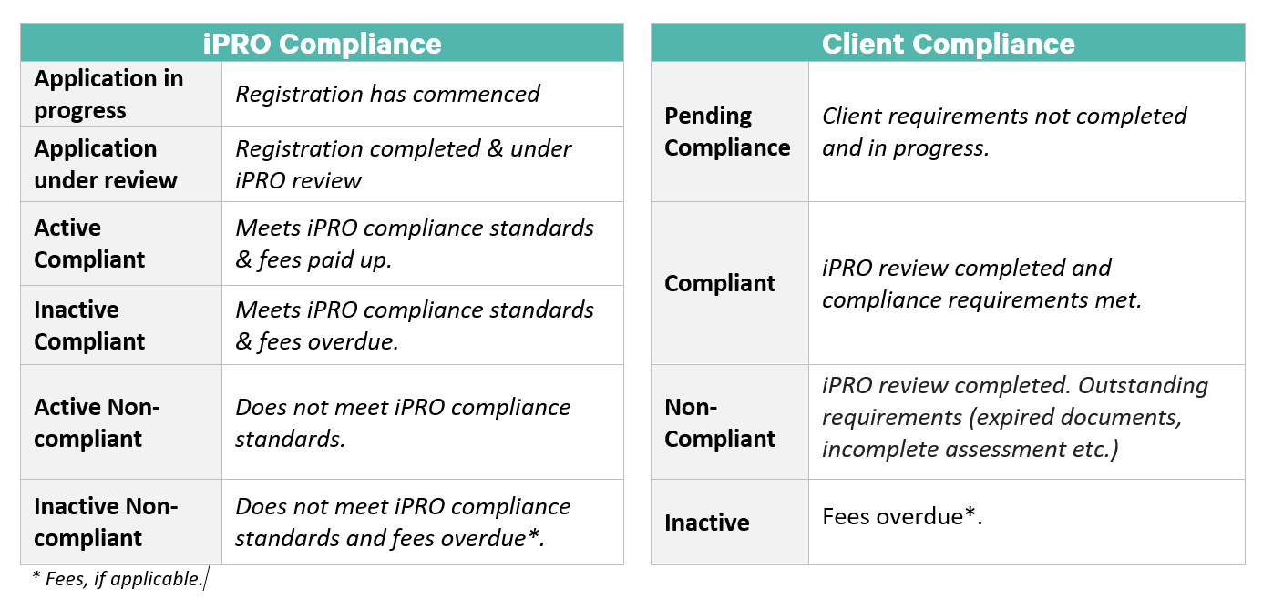 As a Contractor your iPRO profile carries two compliance roles. From the main dashboard you will see your "iPRO Compliance Status", and this demonstrates that you have satisfied the pre-requisites for your clients selected iPRO membership tier. In some cases, your clients have additional requirements that are unique to their organisation (such as additional assessment questions or documents), so you might find that you are compliant for iPRO, but not non-compliant for your Client, as you have not satisfied their unique compliance requirements. To check your "Client Compliance Status", under My Network, select My Clients. If you are connected to multiple clients, you will see a summary of your business's compliance status for each Client.