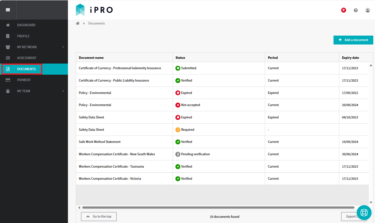 Clicking on DOCUMENTS will display a list of documents, along with their status, validity period, and expiry date.