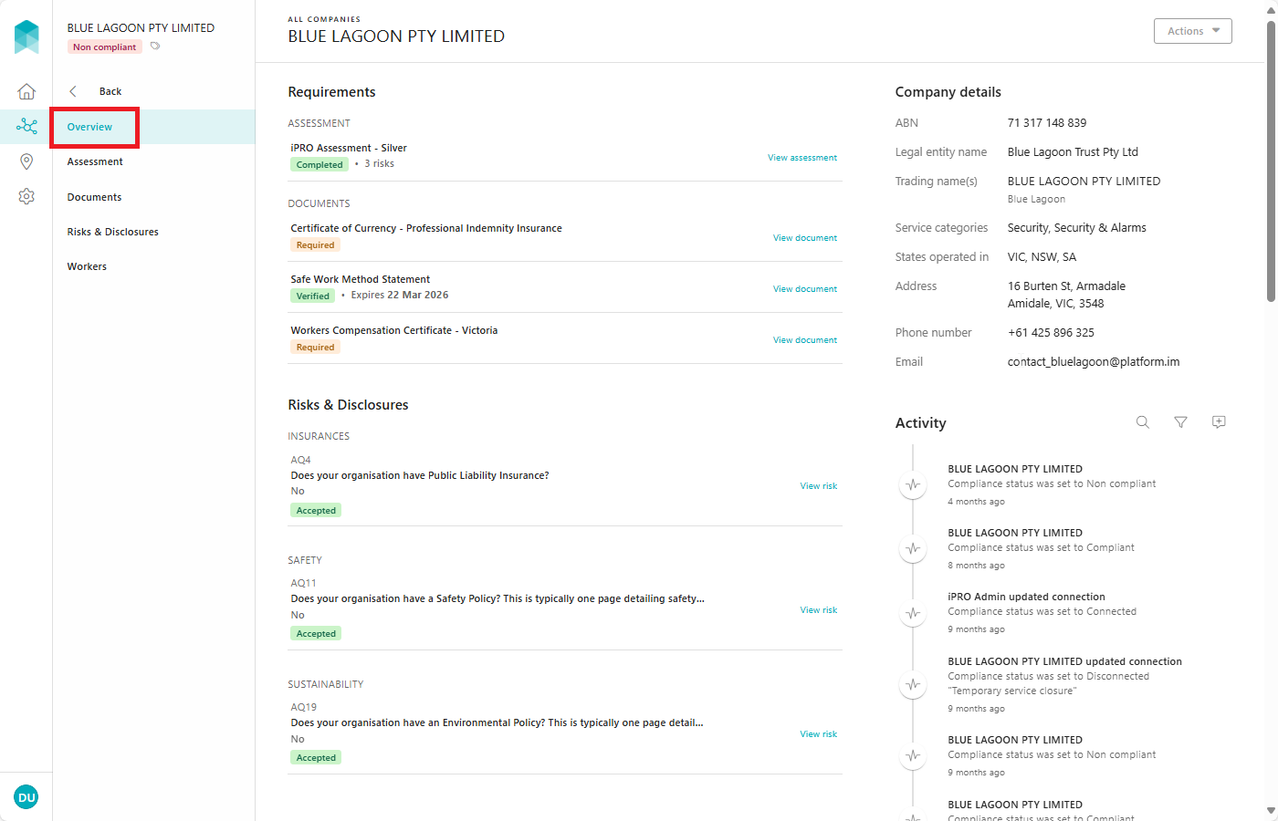 - To view a company's compliance requirements, find and click on the relevant company. You will be directed to the Overview page.