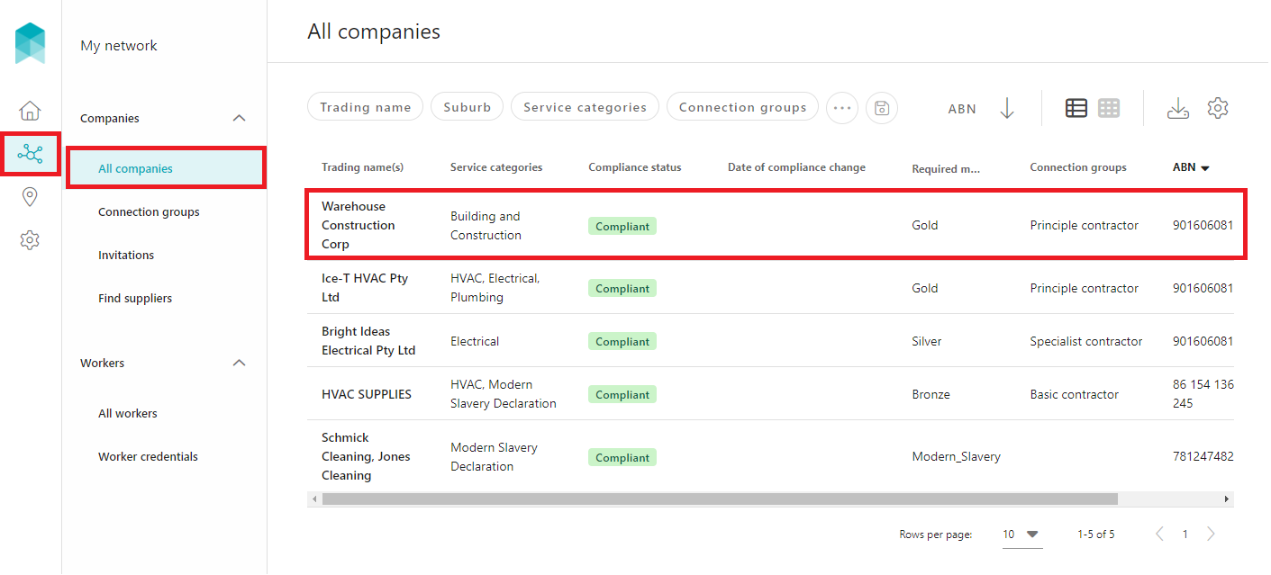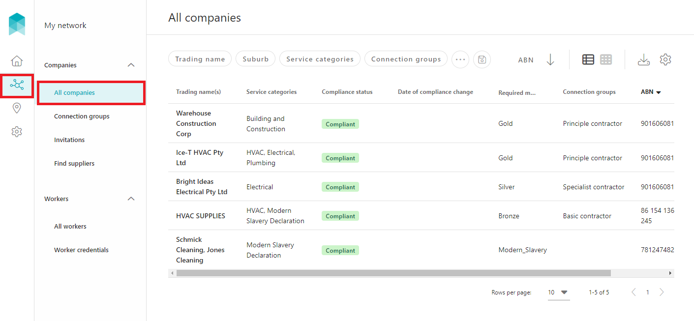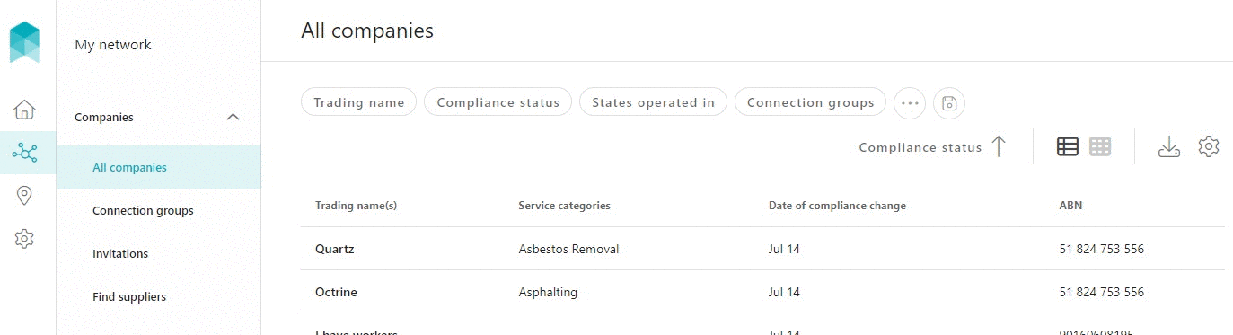 Once the company is disconnected from your account, it will no longer appear within My network > All companies. To view the disconnected companies, filter the list of companies by 'Compliance status' includes one of 'Disconnected', then click on the SAVE button.