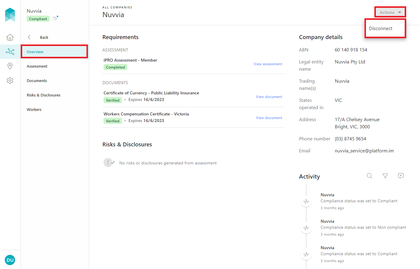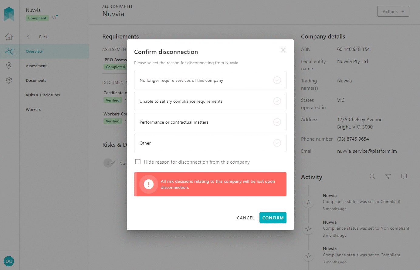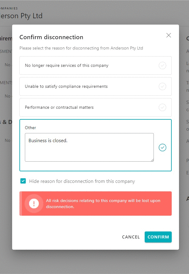 - Upon disconnection of the company, you will no longer be able to view its compliance information, including risk decisions.