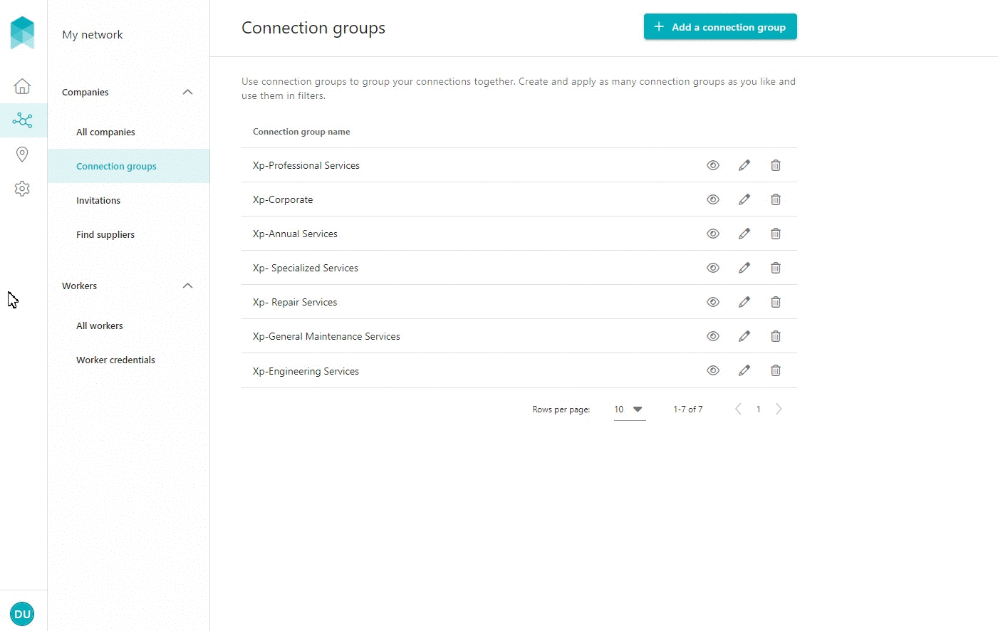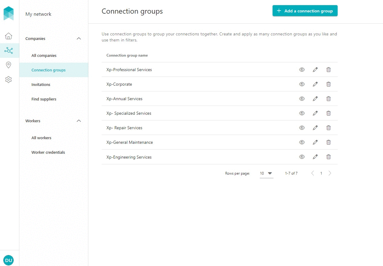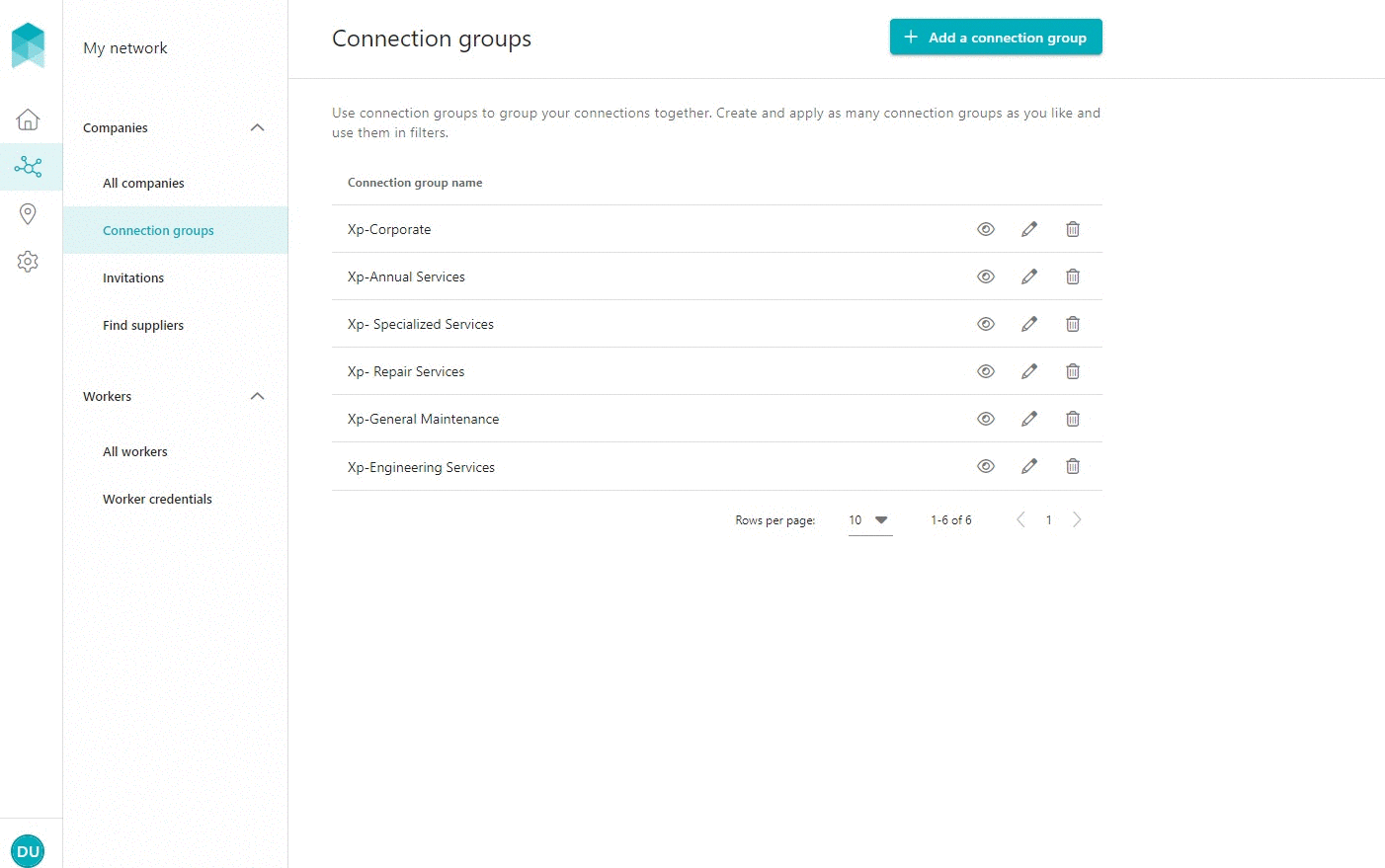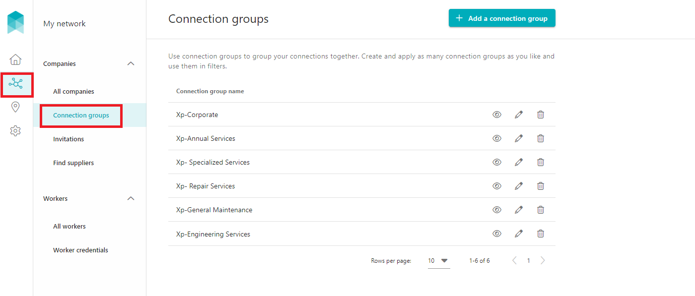 To view the cohort of companies that are assigned a particular connection group, click My network > Connection Groups. Click on Show companies with this connection group indicated by the eye icon. You will be redirected to My network > All companies where a list of companies, filtered by the Connection group, will be displayed.