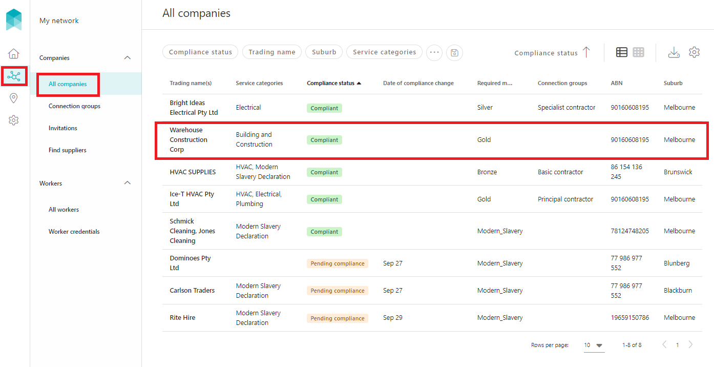 - Click My network in the left hand side menu - a list of All companies in your network will be displayed.