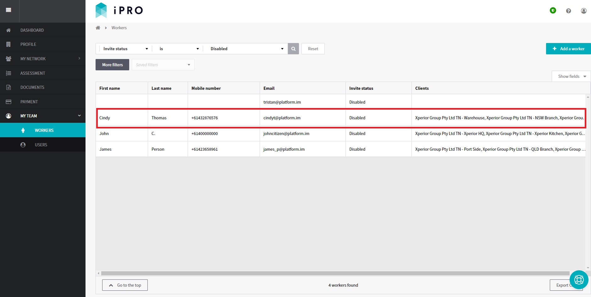 - To view disabled workers, use the search filters: Invite Status is Disabled.