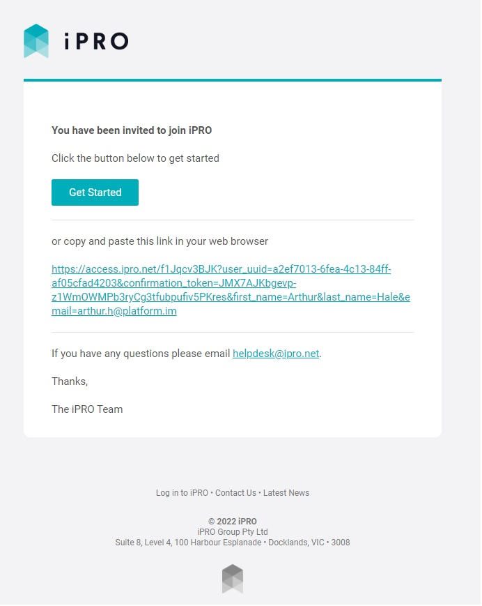 The worker will be sent an email inviting them to join iPRO. After clicking the Get Started button, the worker will be redirected to download the iPRO Access mobile app (if required for check in), and then activate their account by setting a First Name, Last Name, and a Password. Once activated, the worker will appear within the Workers list with an Active status.