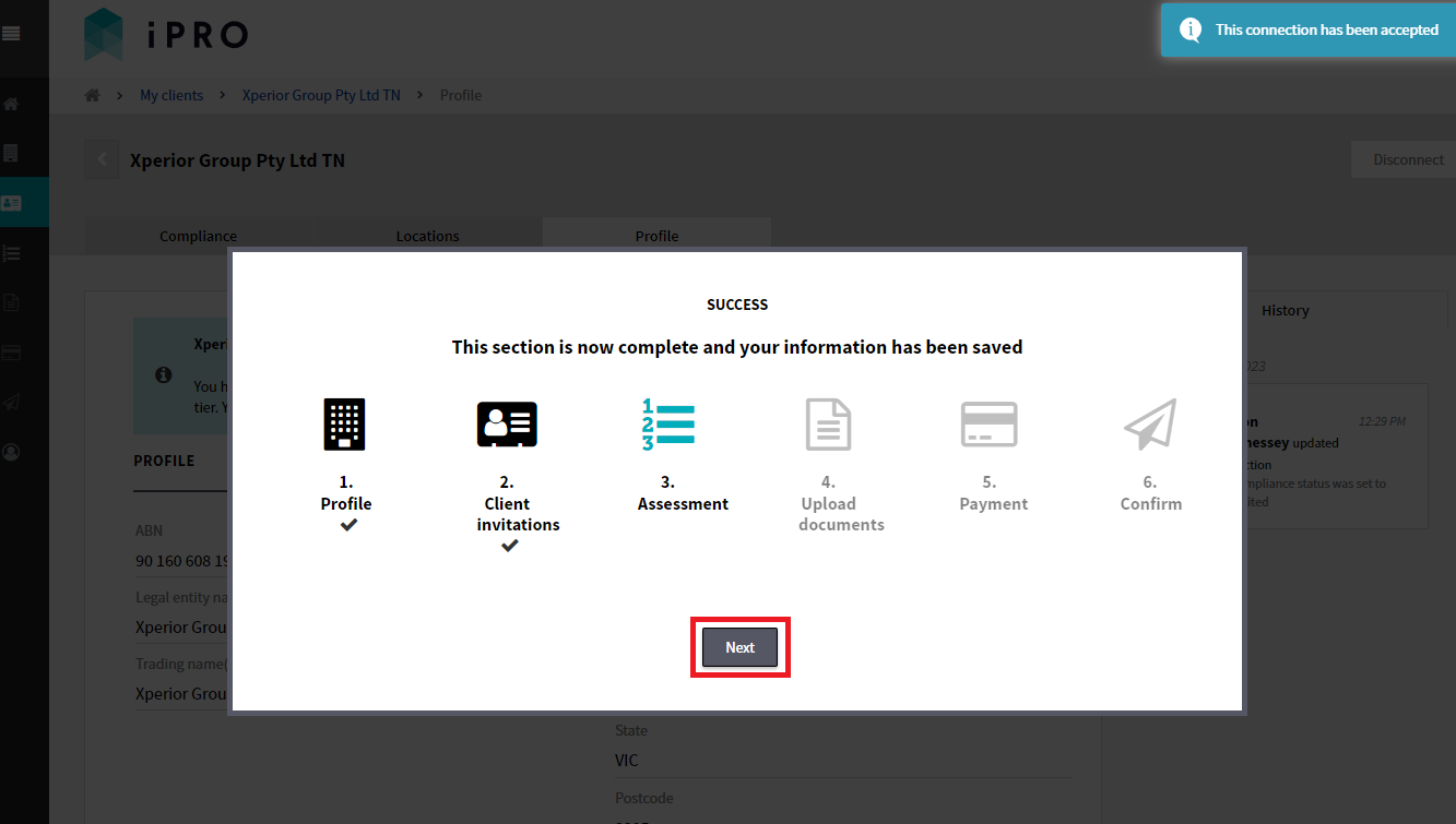 Click Accept invitation towards the top right corner of the page, then click OK to confirm connection with your client.