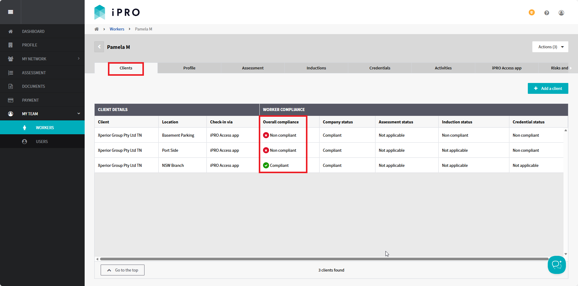 - Click on the worker's record. Their Client Details and Worker Compliance will be shown under the Clients tab.